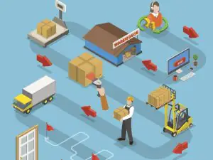 Transport logistics isometric flat vector concept. Shows the way from ordering goods to delivery to the door.