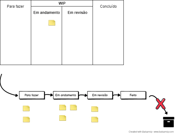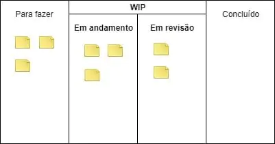 O WIP está representado pelas colunas em andamento e em revisão, pois são as fases que estão em andamento. Ou seja, no exemplo acima, temos como WIP total 5.