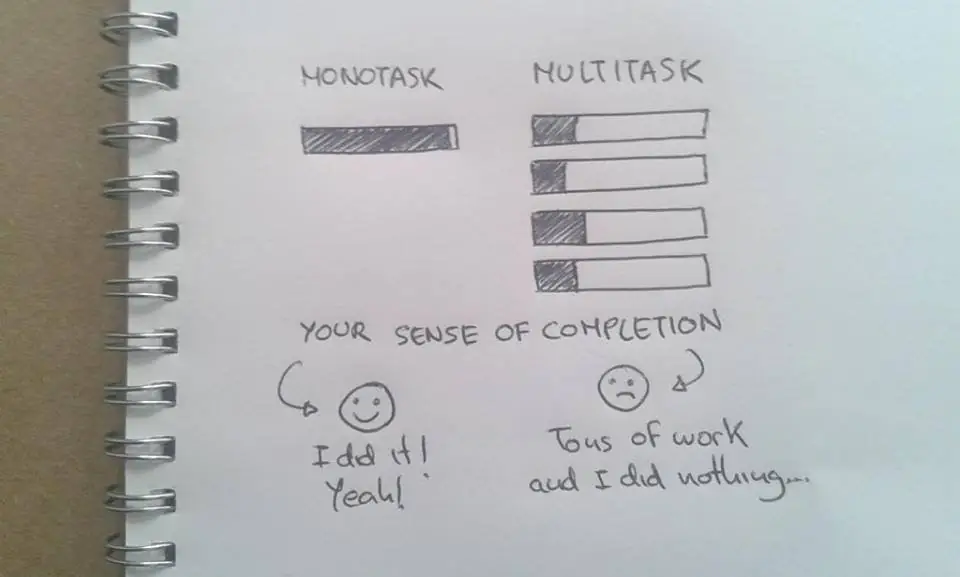 Além da mudança de contexto diminuir a produtividade, a execução de várias tarefas simultaneamente diminui a percepção e o senso de completude das coisas.