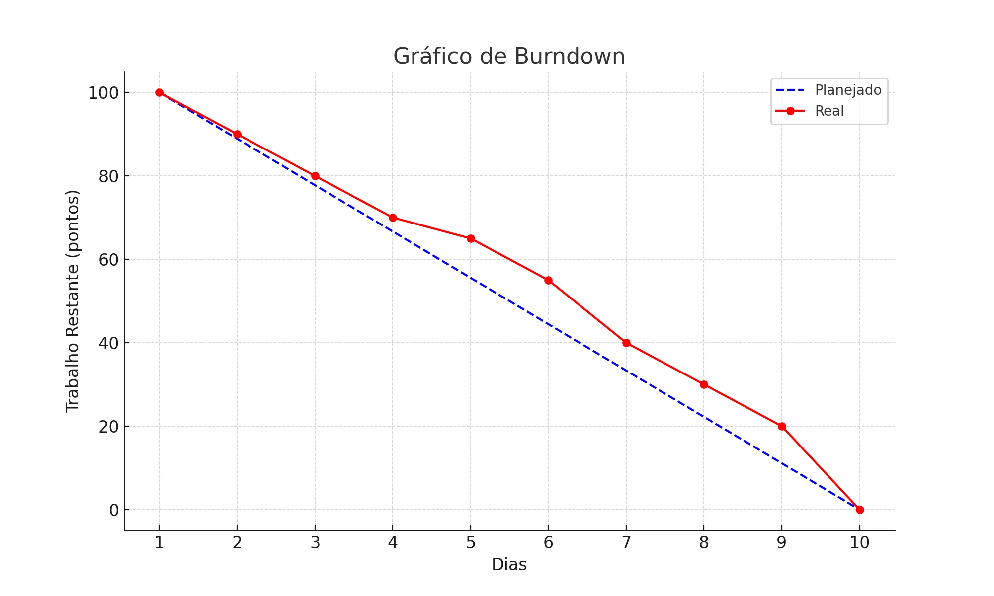 Gráficos burndown (para Scrum) ou burnup (para Kanban) ajudam a visualizar o progresso da equipe em relação às metas estabelecidas ao longo do tempo. Eles são úteis para monitorar se a equipe está no caminho certo para alcançar os objetivos planejados.