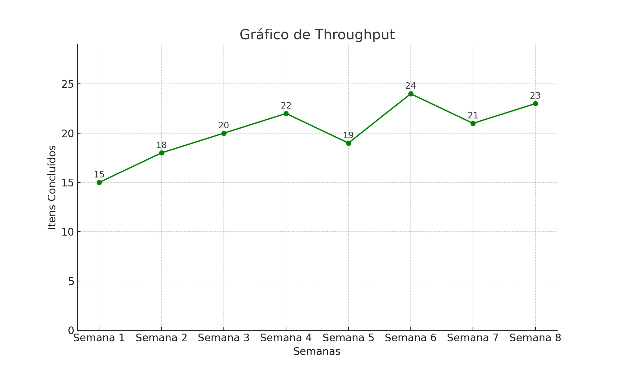 Representa a quantidade de itens de trabalho completados em um período de tempo específico. Pode ser medido em número de histórias de usuário concluídas por sprint ou em tarefas finalizadas por semana, por exemplo.